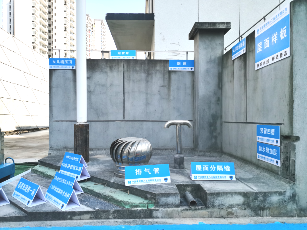 項目踐行全員履職、掛圖作戰,將 “一目標一指令一圖六計劃” 上墻公示,通過 “月初掛牌明確任務、月中跟蹤督導、月底考核兌現” 的閉環管理,推動現場各工序高效開展,僅用 346 天便完成主體結構封頂,助力項目實現完美履約。充分發揮完全總承包管理優勢,項目高標準開展安全質量管控工作:累計打造鋼筋綁扎、模板支設、管道安裝、衛生間防水等 37 項實體樣板;完成實測實量超 3000 個點位;開展防滲漏專項治理,優化混凝土配合比、模板支撐設計、回填層疏排水機制的關鍵環節,確保屋面、衛生間等薄弱部位無滲漏;過程中嚴格落實留痕管控,讓質量 “看得見”、責任 “可追溯”,助力各分部分項工程一次成優。