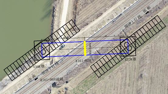 鄭濟高鐵二標三分部茌平特大橋雙線長度為30.28km,位于山東省聊城市東昌府區,于DK106+777.71處上跨邯濟線、京九鐵路(雙線)、牽出線、規劃京九邯濟聯絡線(待建)、邯濟二線,共計6股道,采用1-(72+128+72)m連續梁跨越。跨京九線轉體轉體施工轉體梁位于東昌上林苑(采摘園)內,刁莊村以南,西新河以北,距聊城北站約2.4km;京九線里程約K418+750,邯濟線里程約K143+975。轉體結構長度126m,轉體重量10850t,順時針轉角78°46’,轉體時間共計約79min。